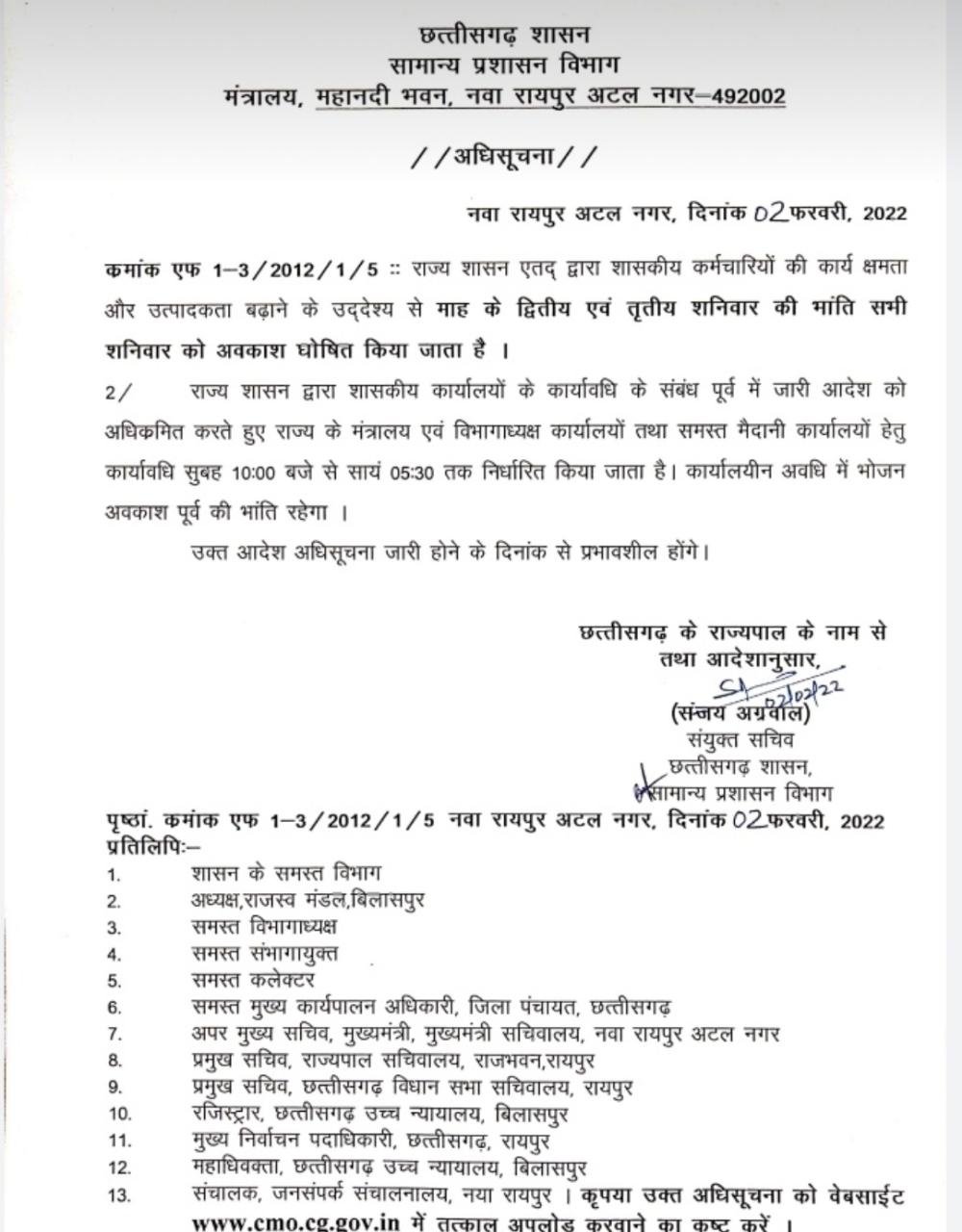 सीएम भूपेश बघेल के ऐलान के बाद सभी शनिवार को छुट्टी के आदेश आज जारी कर दिए गए है।