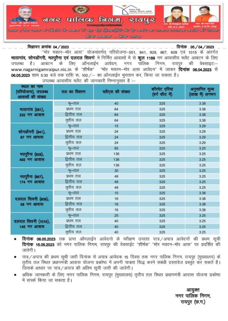 रायपुर. रायपुर नगर निगम ने मोर मकान-मोर आवास के तहत शहर के विभिन्न क्षेत्रों में 1189 फ्लैट्स बिक्री के लिए तैयार कर लिए है. अब रायपुर नगर निगम के नियमों के तहत इसे खरीदा जा सकता है. ये है इस योजना की पूरी जानकारी