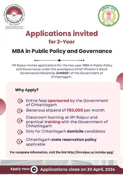यह फेलोशिप विशेष रूप से छत्तीसगढ़ के मूल निवासियों के लिए उपलब्ध है तथा इसमें राज्य शासन की आरक्षण नीति लागू होगी। इच्छुक अभ्यर्थी विस्तृत जानकारी एवं आवेदन के लिए IIM रायपुर की आधिकारिक वेबसाइट पर निर्धारित तिथि तक आवेदन कर सकते हैं।
