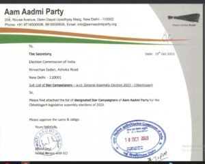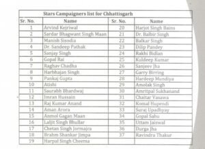 न्यूज़ डेस्क : छत्तीसगढ़ विधानसभा चुनाव के लिए आम आदमी पार्टी ने स्टार प्रचारकों की लिस्ट जारी कर दी है। इस लिस्ट में दिल्ली के सीएम अरविंद केजरीवाल,पंजाब के सीएम भगवंत मान सहित अन्य नेताओं का नाम शामिल है।